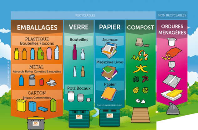 Le tri des déchets se fait en fonction du type de déchet, qu’il soit recyclable ou non. Voici un schéma explicatif dont vous pouvez vous servir pour trier correctement vos déchets.